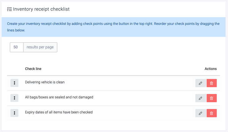 Once you have created some checks, these will all become required on all future inventory receipts before they can be marked as "Added to stock". Breww will enforce that this is done.