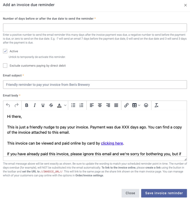 For any customers who have invoices due or overdue in Breww, you will be able to have an automatic email reminder sent to the customer's email address. To create an invoice due reminder, head to Settings->Order/invoice settings->Invoice due reminders. You can then select New reminder schedule.