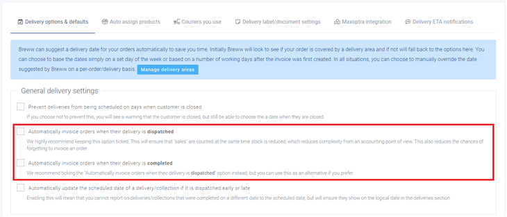 We highly recommend using Automatically invoice orders when their delivery is dispatched, which is on by default. The option to automatically invoice orders when their delivery is completed will only appear if the dispatch option is unticked.
