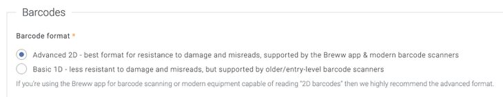We highly recommend using the "Advanced 2D" format and our mobile app, but if you prefer to use a separate barcode scanner, you'll need to ensure it supports reading 2D barcodes (in this case, "Aztec"). If you're unsure, you can print a single label and test your device. If your device does not support the "Advanced 2D" format, you can change your settings in Breww to use the "Basic 1D" format.