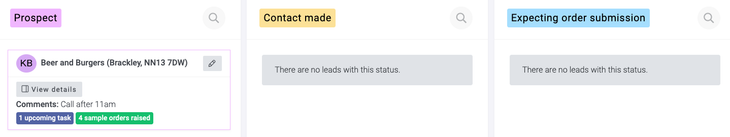 Once you have added your leads, you can easily move them between statuses by clicking on them and dragging them into the status you choose. Alternatively, you can select the edit pencil on the lead to change the status.
