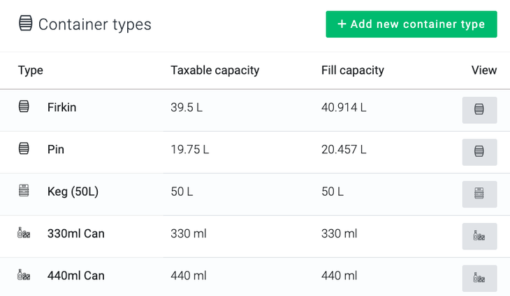 Individual container types should be set up for all your base beer packaging, be it a firkin, non-returnable keg or 440ml can. To create a container type, go to Containers ->Add new container type. You can then choose your container type name, gross capacity, taxable capacity and type. The three types to choose from are cask, keg or smallpack. It is important that your container types are for the base containers only, not multipacks. For example, "440ml can" can be a container type, but not "24 x 440ml can". Multipacks are products made from multiple single container types.
