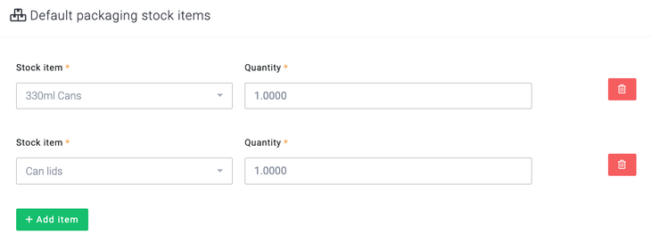 Within a container type, you can specify which "default packaging stock items" (if any) are always used when racking into that specific container type. For example, a 330ml can container type may always use a 330ml can from your stock, in addition to a can lid, and for a firkin, you might use 1 x shive and 1 x keystone. This is especially useful for tracking cost and inventory during the racking process. These items will be used by default when packaging directly from a vessel or container, in addition to any stock items assigned directly to the product. Default packaging stock items can be added by editing an existing container type. For more information on adding your stock items, please see our guide: Assigning stock items.