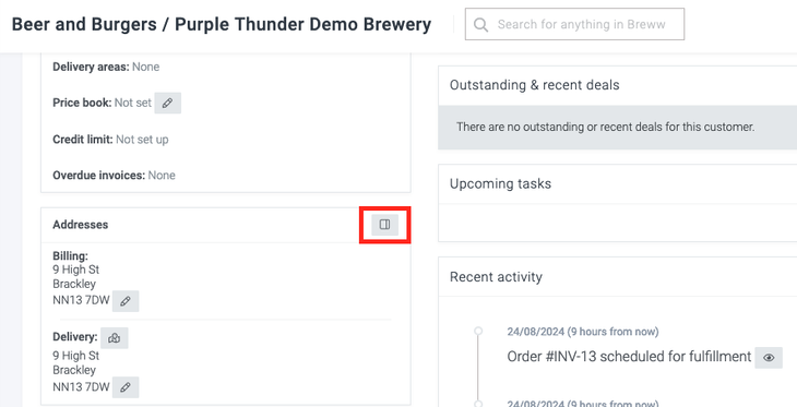 To view and manage all addresses for a customer, click the icon to the top right of the Addresses section on a customer's page.