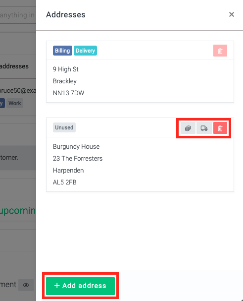 From here, you can add a new address, delete any unused addresses, and set the default billing and delivery address for that customer to one of their other addresses.