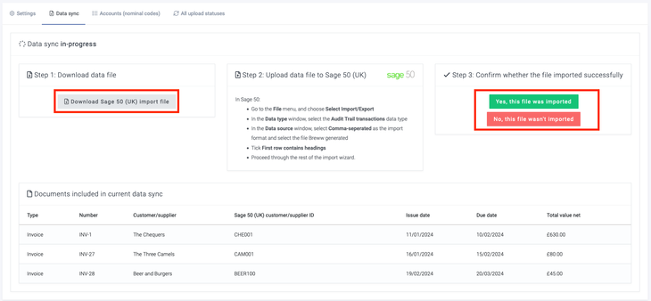 Once the data has been successfully imported, you then need to confirm to Breww that this has been done by clicking the Yes, this file was imported button on the right-hand side. Once done, Breww will record that the included documents have been imported and won't include them in future data syncs.