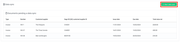 To start a manual data sync, go to the Data sync tab. Here, you can see all the documents that Breww doesn't think have been successfully imported into your accountancy software. Click Start data sync.