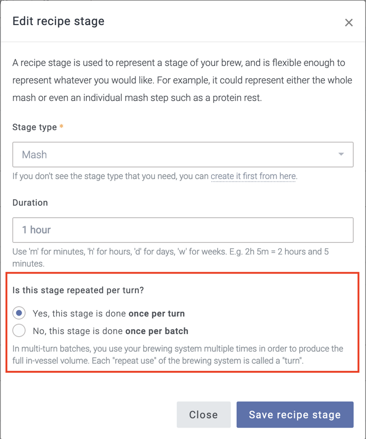 In order to use a recipe on a multi-turn batch, Breww needs to know which stages of the recipe should be repeated per turn and which happen only once per batch.
