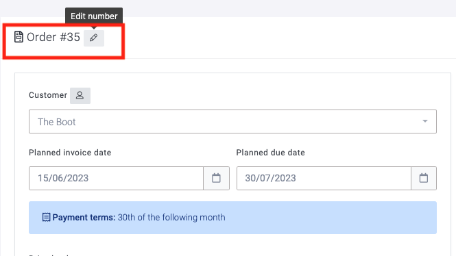 When viewing the order/credit note, you will see a pencil on the top left of the number. Clicking this allows you to edit the number.