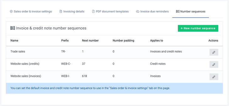 To do so, go to Settings -> Order/invoice settings and click on the Number sequences tab. From here, you can manage your invoice and credit note number sequences and ensure they are configured to continue from where you have got to with any previous software.
