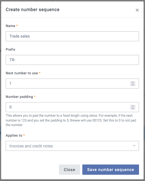In Breww, you have the ability to define how you would like invoice and credit note number sequences to work. This allows for: