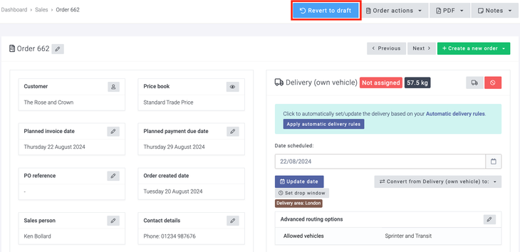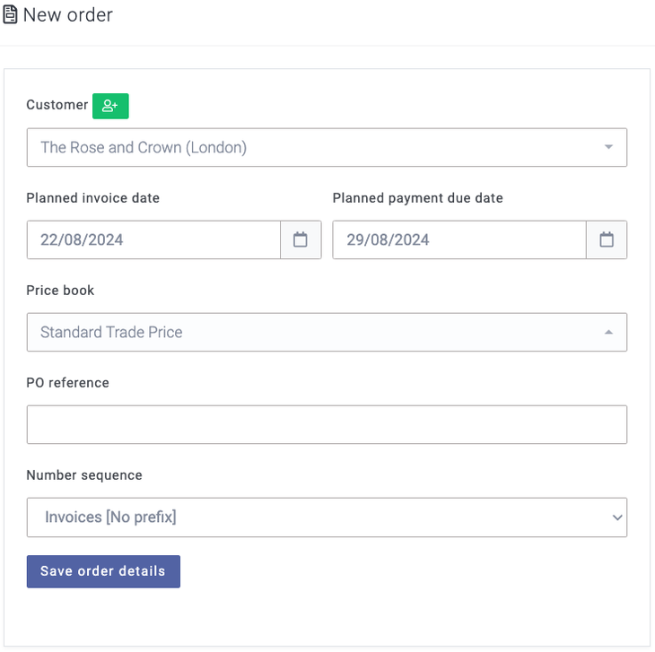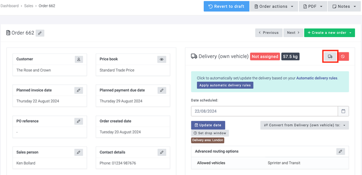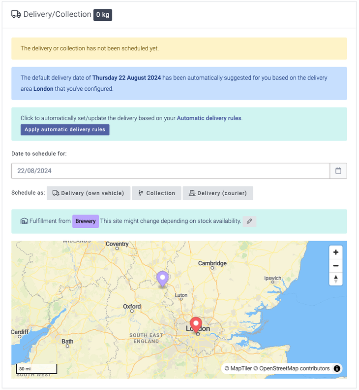 By selecting Save order details, the order will be saved, and an order number will be allocated. This will also then display the delivery/collection details and options. The suggested 'Date to schedule for' will be based on your delivery areas if you have created these; if not, then Breww will use the Default delivery date set in your Delivery settings. In this example, my next delivery day for the delivery area of London is 22/08/2024. If more advanced Automatic delivery rules have been created, then you will be able to apply these here instead; these will be automatically applied if you have this set to apply on order confirmation; you can read more on this topic here: Delivery rules.