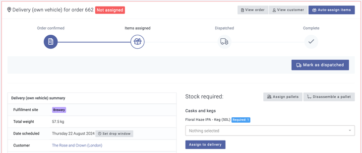 From here, you can manually assign stock and select to dispatch an order; however, for the best experience when assigning stock and dispatching deliveries, we recommend assigning stock via our mobile barcode scanning feature on the Breww mobile App and dispatching orders from the main deliveries page, where you will be able to optimise your delivery routes and dispatch orders for the entire day. For more on handling the assigning of stock, please see the guide: Delivery stock assignment.