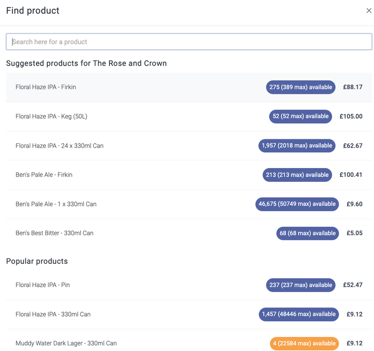 This will display your products and the available stock; how the stock is displayed will depend on your settings. You can read more on these settings here: Setting the stock figure to display when adding a product to an order.