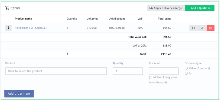 Your products will now appear on the order, which can be edited using the edit pencil or deleted using the red button.