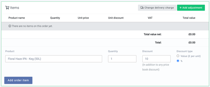 Once you have selected a product, you can add a discount to the line item, either as a percentage or as a value, by entering the discount amount into the discount box and selecting the discount type. In the example below, a 10% discount will be added; you can then select Add order item.