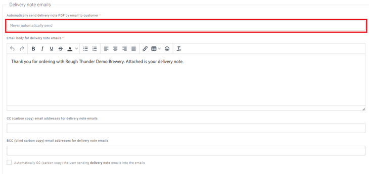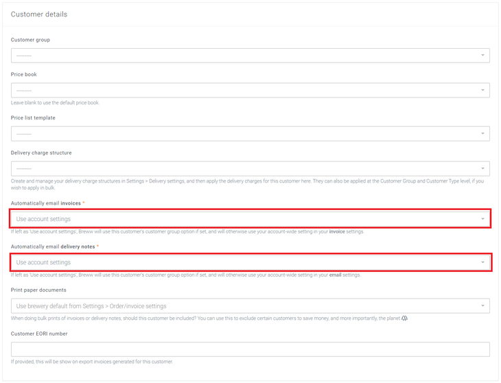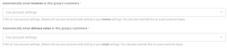 When editing or creating a parent company, you will have the option to choose whether Breww should "Automatically email invoices to this parent company's customers" and whether Breww should "Automatically email delivery notes to this parent company's customers", what you choose here will override the account defaults on whether emails should be automatically sent, but will not override what you set on the customer themselves.