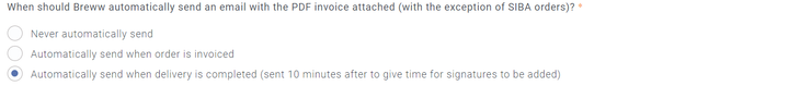 The first thing you decide is whether the parent company entity itself receives invoice emails; this is decided by your account default settings for "When should Breww automatically send an email with the PDF invoice attached (with the exception of SIBA orders)?", this is set in Settings->Order/invoice settings-> Sales order & invoice settings under the heading of Invoice issuing settings. Whatever you set here will apply as default and determine if the parent company receives invoice emails.