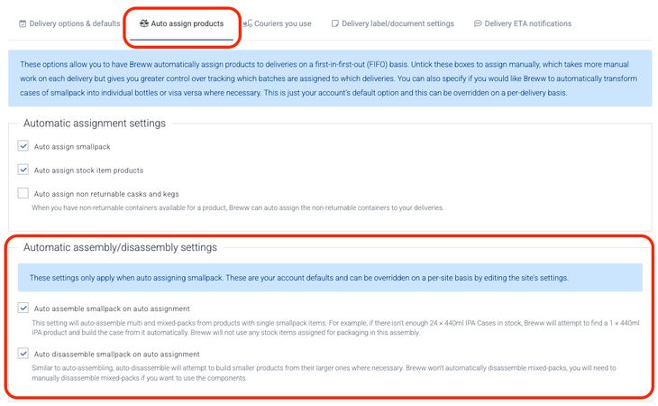 To let Breww automatically handle this for you, go to Settings -> Delivery settings -> Auto-assign products (tab). If the auto-assemble/disassemble tool is enabled, product reformatting will occur at the point of stock assignment within an order. When reformatting stock, Breww takes into account the "theoretical max" stock value (seeUnderstanding stock levels for more on what this means).