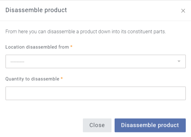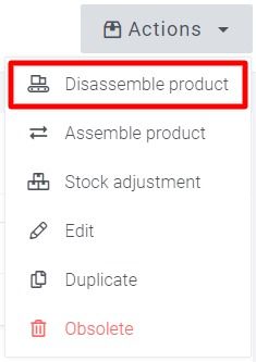 Disassembling refers to the opposite process - for example, if you have some 24 packs of a beer in stock and a customer has ordered an individual bottle, you may need to split one 24 pack into 24 individual bottles to fulfil the order. The remaining 23 bottles will be in stock still for subsequent orders (or to be assembled into other products).