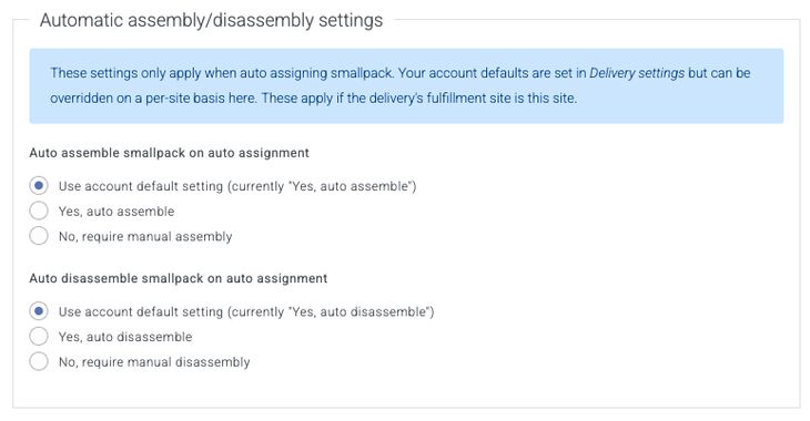 In some cases, you may wish to have the auto-assemble/disassemble tool enabled for some orders only. These settings can be overwritten on a per-site basis by editing the site's settings. The site that applies is the order's fulfillment site.