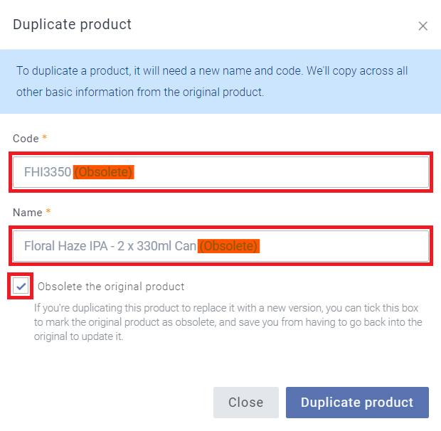 - The Duplicate product window will open, and from here, you can quickly recreate the product with all the details copied over. You will want to delete the (obsolete) part of the Code and Name and then select Obsolete the original product to quickly simultaneously obsolete the incorrect product.