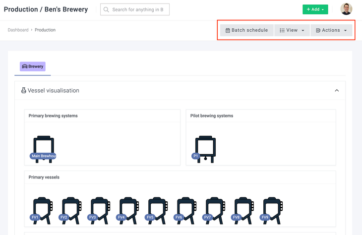 There are three buttons on the production dashboard to navigate around the production suite. This article will define the options listed here, but the features under these options will be covered later on in more detail in the Production in Breww guide.