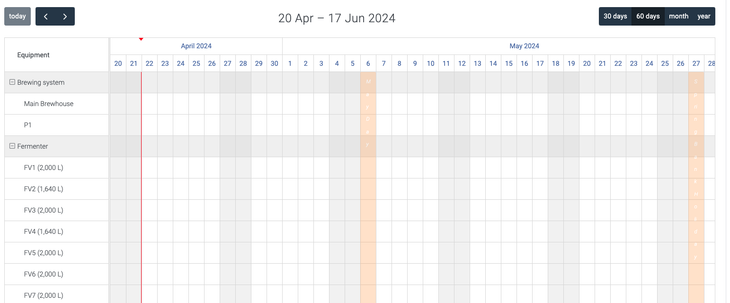 By selecting this button, you will see a calendar that includes all of your vessels and equipment, where you can schedule your batches and vessel usage. You will also be able to select to view your scheduled batches with your contract brewers and your 'planned packages' here.