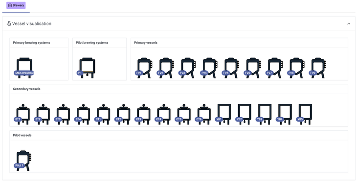 If you have a pilot brewing system and vessels, then these will also show. You can view the key data surrounding the vessel by clicking on the vessel. If you have multiple sites that you use for brewing, then you will be able to switch between sites by selecting the site tab at the top of the visualisation; in this example, there is a single site for brewing called 'Brewery'