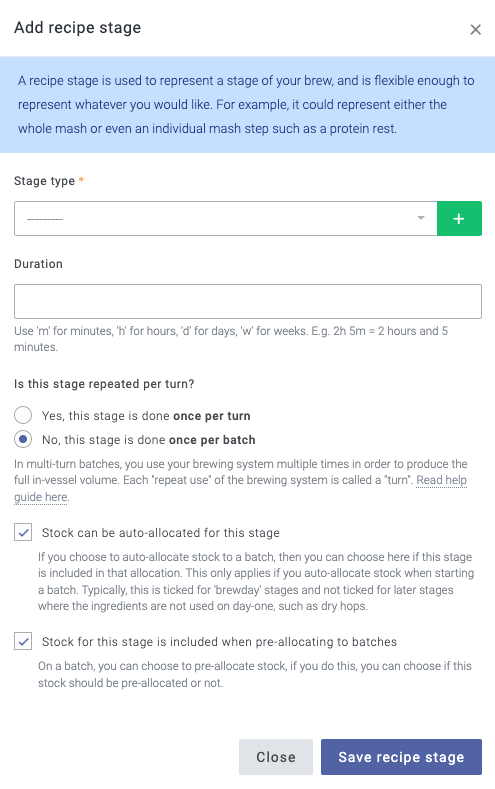 When you are in your recipe, you can select Add stage to add your stage types (you can also add new types by selecting ). You then have the option as to whether to auto-allocate and pre-allocate stock for the stage and select whether this stage is repeated per turn. For more on multi-turn batches, then please see our Multi-turn batches help guide!