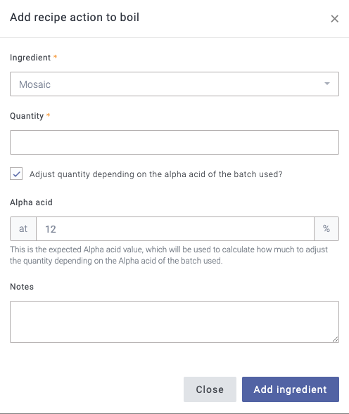 Please note that when entering your ingredient additions, you enter the full quantity required for the total volume of the recipe, and don't enter the amount you would enter per turn, as Breww will be able to auto-calculate this for you when scaling multi-turn batches.