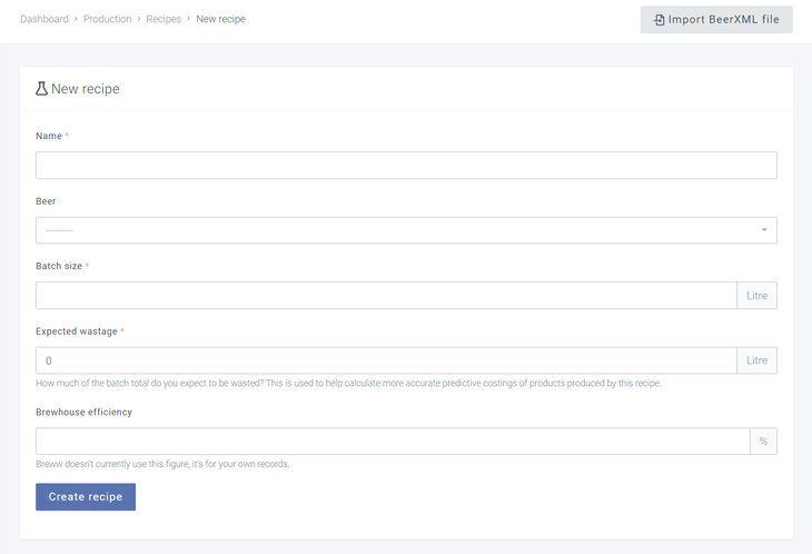 You will need to enter a batch volume and your expected wastage for the recipe. Our Recipe/batch volumes article explains further how batch volumes are used in Breww and what figures should be entered. You can also optionally associate this recipe with your beer now if you have already created it and enter a brewhouse efficiency (This is not auto-calculated and is for your own records).