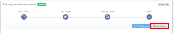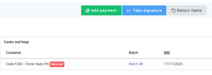 If you need to return items/products from an order, such as kegs and cases, you can use the Return items button on the completed delivery page to return the items into stock. This can be used for all types of products, including casks, kegs, stock items and more.
