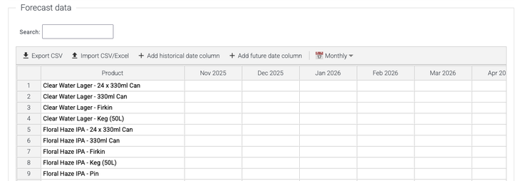 If you prefer to generate your forecast in Excel or another software, we recommend starting with our import template, which enables you to import your forecast back into Breww easily. To do this, define your forecasting period (Weekly or Monthly) and add the relevant periods, as if you were about to enter your figures manually. Then, export the template using the Export CSV button. This will generate a CSV file with Product ID and Product name columns, as well as a column for each time period in a format Breww's importer can understand. Once you've entered your forecast, simply import it back into Breww using the Import CSV/Excel button.
