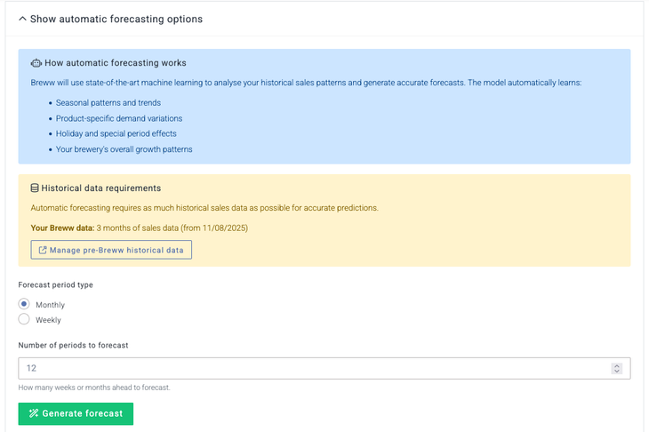 To access the automatic forecasting tools, click the Show automatic forecasting options dropdown. The more historical data you have in Breww, the more accurate your forecasts will be. If you are new to Breww, Breww will highlight if you have less than two full years of sales data, and link you to Manage pre-Breww historical data, which you can read more about below.
