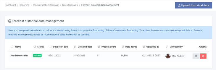 Here, you can upload basic sales data by clicking Upload historical data, to allow Breww to start making accurate forecasts immediately. You can upload a CSV or Excel file with the following headers: Product code, Product name, Date, Quantity. The product must exist in Breww to upload the historical data for it, and we recommend having a single row per product, date and quantity. Once uploaded, Breww will add this data to your existing Breww sales data when making any forecast.