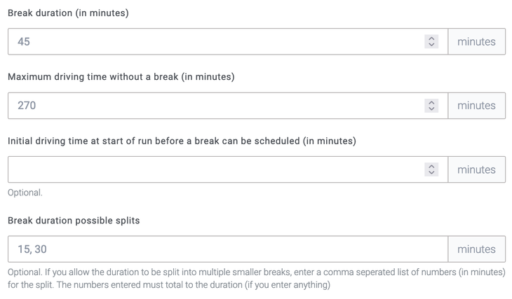 It's your responsibility to ensure that you are compliant with any applicable driving regulations and to ensure that any breaks that are generated by Breww do in-fact cover your requirements. For example, with the EU Drivers' Hours, there are more rules around the breaks than can be configured in Breww, such as the requirement for at least 11 hours of rest every day. Having said this, Breww can be configured to help you meet the "a break or breaks totalling at least 45 minutes after no more than 4 hours 30 minutes driving" requirements. The screenshot above shows how to configure this particular requirement in Breww (and allow the 45 minute break to be taken in two parts, a 15 minute break and 30 minute break).