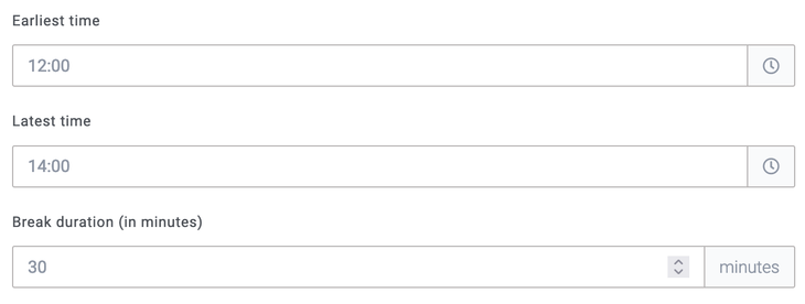 Simply set your break duration and the times that it should occur between. In the example screenshot below, this would schedule a 30 minute break between 12 noon and 2pm.