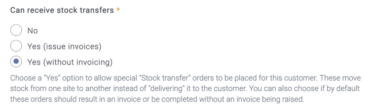 Before you can raise a stock transfer order, you'll need to create a "Customer" account for the receiving entity. In some situations, this might exist already (e.g. if you run multiple related businesses), but if not, you can create a customer for yourself. This customer needs to have the Can receive stock transfers option enabled, which can be done when creating them or by editing them if they already exist (this is in the Customer invoicing and billing section of the form).