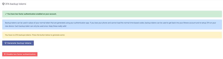 This will enable you to access your account. Once in, there will be an option to Generate backup tokens. Backup tokens can be used instead of regular tokens generated using your authentication app. If you lose your phone and cannot load the standard time-based codes, backup tokens can be used to get back into your Breww account and re-set up 2FA on your new device. Each backup token can only be used once, so keeping these safe is essential!