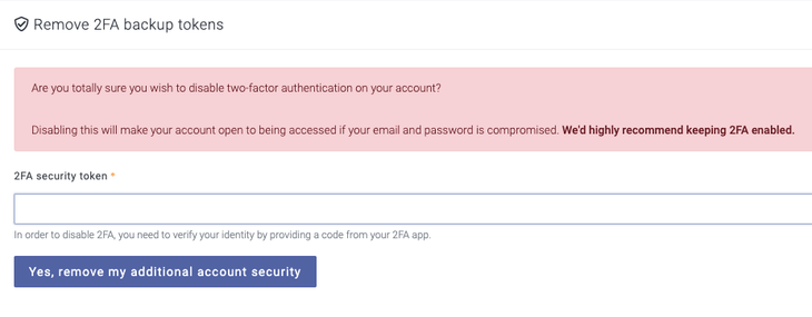 Once you have selected to disable 2FA, you will be required to enter a final 2FA security token.