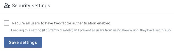 A brewery admin can access this by heading to Settings -> Users & security settings. At the bottom, you will see a section called Security settings, giving the option to mark Require all users to have two-factor authentication enabled. Check this box, and all users registered to the brewery account will now require a one-time code through an authentication app.