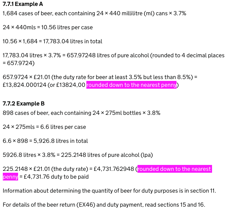 We've had a few reports that the online EX46 (Beer duty) form is rounding the final amount due differently from Breww. The online duty form is rounding half up to 2 decimal places, whilst Breww is rounding down to 2 decimal places.