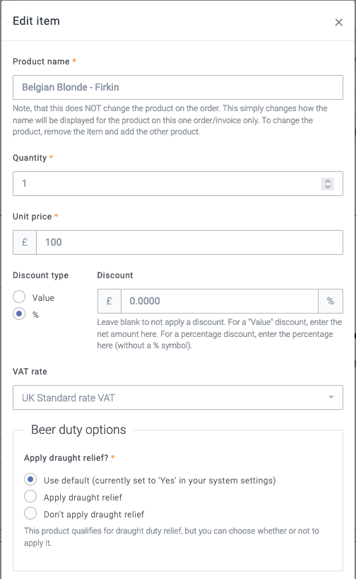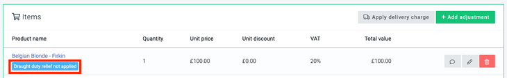 If your settings are set up so that Breww will not apply draught relief to an invoice item, this will be made clear with an alert on the invoice item.