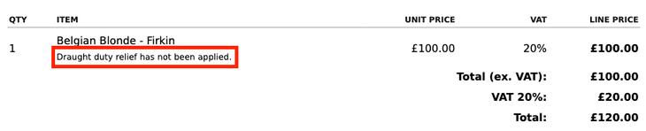 If you haven’t applied draught relief on a product and have elected to pay the full rate so that your customer can sell takeaway beer (or any other reason), then HMRC require this to be made clear on any documentation you provide your customers.