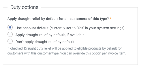 This flexibility allows you to have draught duty relief automatically applied to any qualifying products sold to customer types that don’t sell takeaway beer, such as a traditional pub, but stop Breww from applying it for customer types who need the ability to sell takeaway beer, such as a bottle shop.