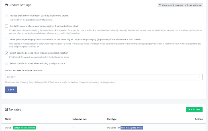 Each product in Breww is linked to a tax rate. This can be our managed "US GST" rate (where the actual rate percentage depends on who is buying the item), or one that you manage yourself with a fixed rate that you define.