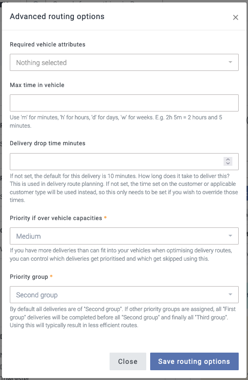 Priority group - By default, all deliveries are of "Second group". If other priority groups are assigned, all "First group" deliveries will be completed before all "Second group" and finally all "Third group". Using this will typically result in less efficient routes.
