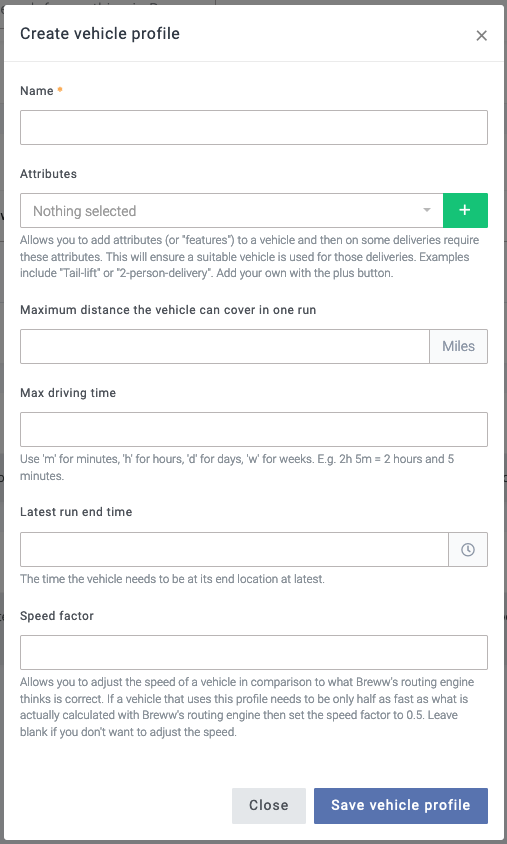 You can create vehicle profiles (and assign vehicles to them) to fine-tune how Breww's Advanced Deliveries routing works. Get started at Settings -> Delivery settings -> Vehicles.