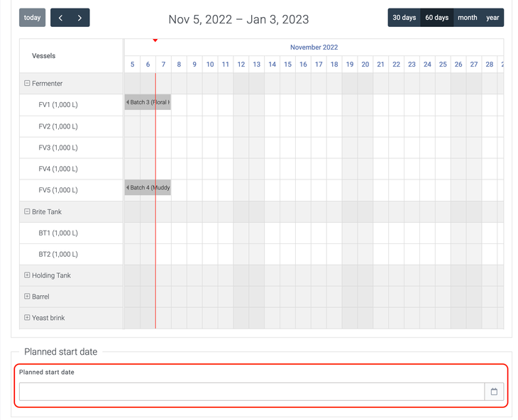 If you plan any vessels to use in your batch, then Breww will automatically determine the batch start date from the date that the first vessel is used. If you don't plan any vessels, then you can choose a planned start date from an input that shows below the vessel planning calendar (this is hidden if you have any vessels planned).